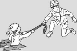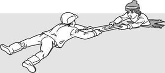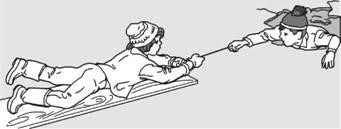 При оказании помощи провалившемуся под лед опасно подходить к нему близко. К пострадавшему следует приближаться лежа, с раскинутыми в сторону руками и ногами. Если помощь оказывают два-три человека, то они ложатся на лед и цепочкой продвигаются к пострадавшему, удерживая друг друга за ноги, а первый подает пострадавшему лыжные палки, шарф, одежду и т. д. Деревянные предметы (лестницы, жерди, доски и др.) необходимо толкать по льду осторожно, чтобы не ударить пострадавшего. Спасатель при этом должен обезопасить и себя. Продвигаясь к пострадавшему, следует ложиться на доску, лыжи и другие предметы.
