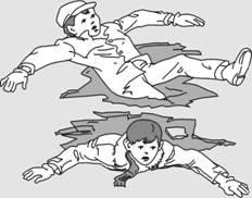 В случае провала льда под ногами необходимо действовать быстро и решительно, широко расставив руки, без резких движений, удержаться на поверхности, переползти на поверхность крепкого льда, а затем, лежа на спине или груди, продвигаться в ту сторону, откуда пришел, одновременно призывая людей на помощь.